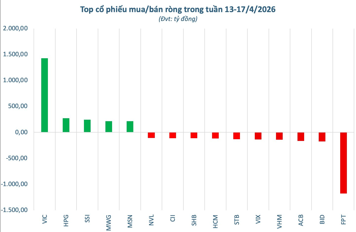 Ở chiều ngược lại, FPT là tâm điểm bị bán ròng mạnh nhất với khoảng 1.176 tỷ đồng, vượt xa các mã còn lại. Tiếp đến là BID (-173 tỷ đồng) và ACB (-164 tỷ đồng). Nhiều cổ phiếu khác cũng chịu áp lực rút vốn như VHM (-141 tỷ đồng), VIX (-135 tỷ đồng), STB (-131 tỷ đồng), HCM (-118 tỷ đồng), SHB (-114 tỷ đồng), CII (-110 tỷ đồng) và NVL (-106 tỷ đồng).