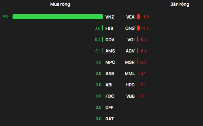 Ở chiều ngược lại, VEA bị bán ròng mạnh nhất với khoảng 2 tỷ đồng, theo sau là QNS (-2 tỷ đồng), VGI (-1 tỷ đồng),…