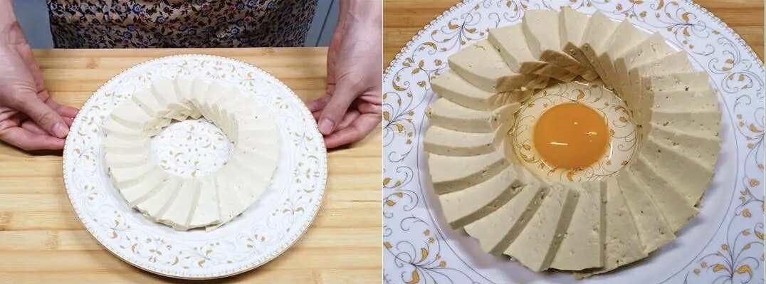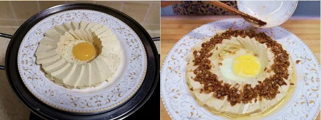 Bước 1: Đậu phụ non bạn cắt thành từng lát dày xếp xung quanh đĩa. Sau đó đập quả trứng gà vào giữa rồi cho vào nồi hấp trong khoảng 8 phút.