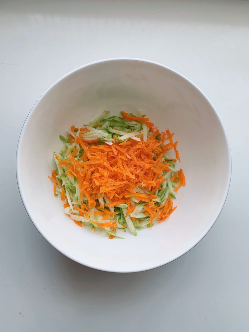 Bước 1: Rửa sạch và bào bí ngòi cùng cà rốt thành sợi nhỏ. Sau đó thêm một chút muối vào ướp khoảng 5 phút. Sau đó bạn vắt bớt nước rồi cắt nhỏ. Đập trứng gà vào bát tô, thêm bột mì vào bát tô, thêm hành lá thái nhỏ, hạt tiêu, chút xíu gia vị và bí ngòi cùng cà rốt rồi trộn đều.