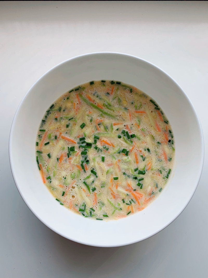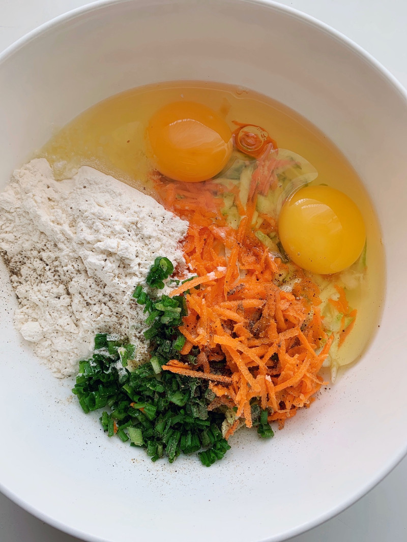 Nguyên liệu: 2 quả trứng gà, nửa củ cà rốt, nửa quả bí ngòi, 100g bột mì, 2 cây hành lá thái nhỏ, một chút bột tiêu, gia vị.