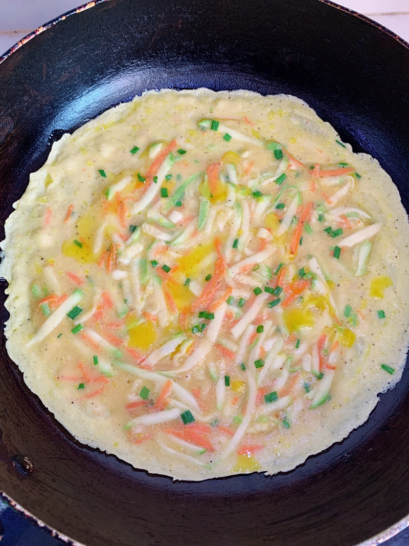 Bước 2: Dùng cọ nấu ăn, phết một lớp dầu ăn lên chảo. Sau đó bạn múc một muôi hỗn hợp bột, đổ vào rồi dàn đều. Chiên bánh trên lửa nhỏ cho đến khi cả hai mặt có màu vàng nâu. Lấy bánh kếp bí ngòi và cà rốt ra đĩa rồi thưởng thức.