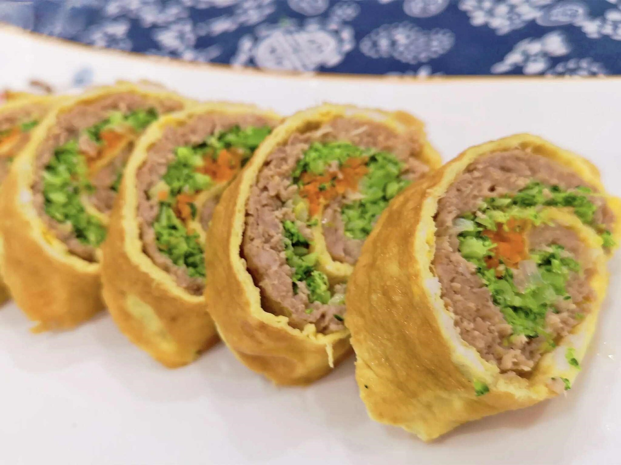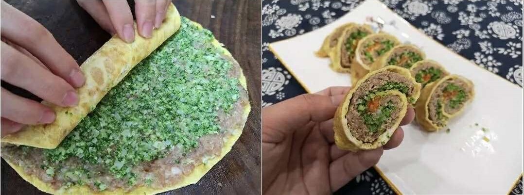 Vỏ trứng vàng ươm bọc toàn bộ phần nhân thịt cùng rau củ ngập tràn hương thơm. Món ăn với nhiều lớp hương vị vừa giàu protein lại có cảm giác mát lành từ các loại rau củ. Món ăn này dùng trong bữa sáng vừa no bụng lại tốt cho những người đam mê thể hình!