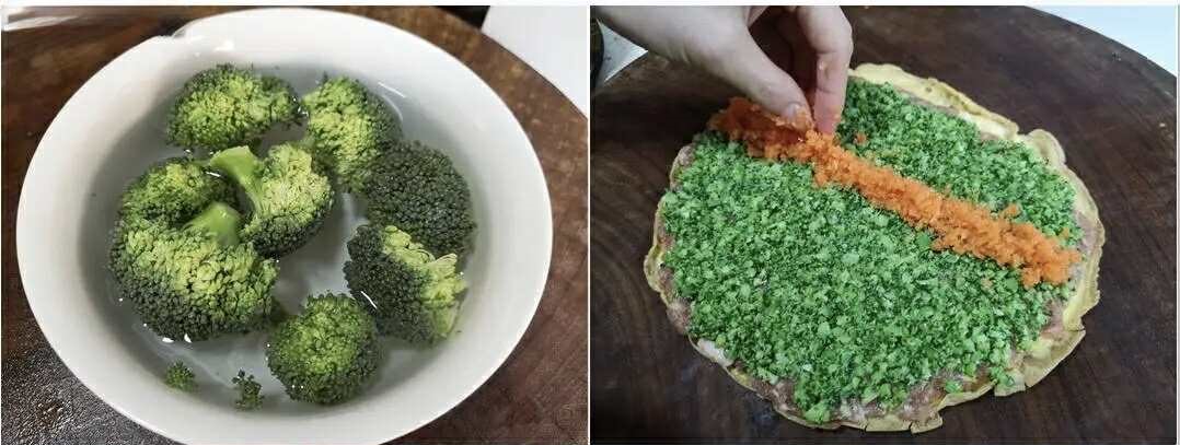 Bước 2: Đập trứng vào bát tô, đánh tan rồi cho vào chảo chiên chín vàng. Lưu ý độ dày vừa phải để tránh nứt gãy khi cuộn nguyên liệu. Bạn cũng có thể thay trứng bằng váng đậu tươi để tiết kiệm thời gian nấu nướng. Tiếp theo bạn đặt trứng chiên lên mặt phẳng cho phần nhân thịt bò vào, phết đều khắp. Tiếp đó cho súp lơ xanh phủ đều lên lớp nhân thịt bò. Cà rốt băm bạn cho vào giữa. Sau đó từ từ cuộn chặt lại.