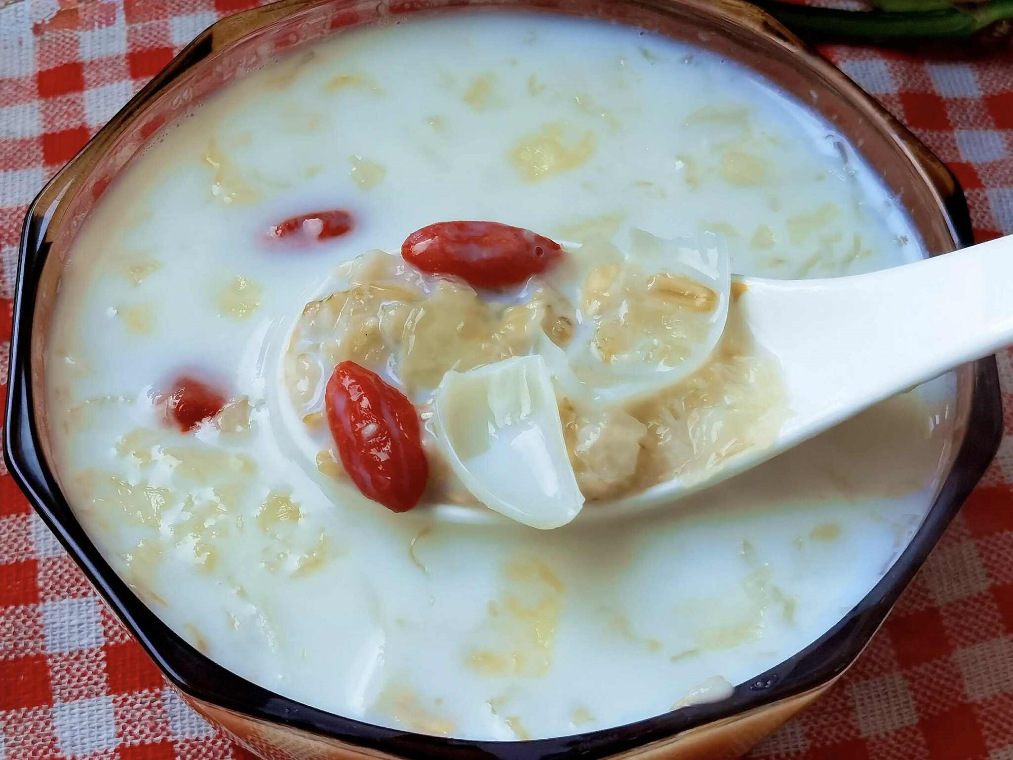 Nguyên liệu: Nửa cây nấm tuyết, 10g củ hoa huệ khô, 100g yếm mạch, 250ml sữa tươi, 10g kỷ tử.