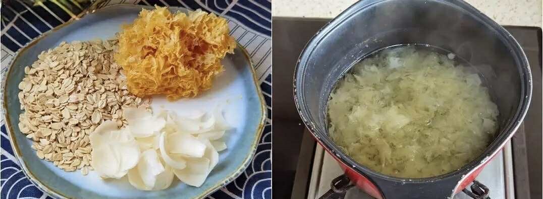 Bước 1: Ngâm nấm tuyết cho nở mềm. Sau đó rửa sạch nấm tuyết rồi xé thành từng miếng nhỏ. Ngâm củ hoa huệ khô cho đến khi nở mềm. Đổ lượng nước vừa phải vào nồi, thêm nấm tuyết và hoa huệ cùng yến mạch vào.