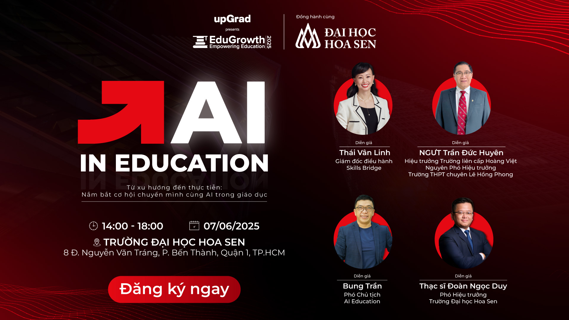 Sự kiện upGrad EduGrowth: AI in Education sẽ diễn ra từ 14:00 – 18:00 ngày 07/06/2025, tại Trường Đại học Hoa Sen, số 8 Nguyễn Văn Tráng, Quận 1, TP. Hồ Chí Minh.