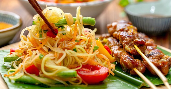 Món ăn này sử dụng đu đủ xanh làm nguyên liệu chính, kết hợp với tôm khô cùng các loại rau, củ, quả tươi khác. Đu đủ xanh ăn giòn mát, quyện trong nước sốt kiểu Thái chua, cay, cực đậm đà, đưa vị. Vào những bữa cơm ngày hè mà có món ăn mang vị chua, cay và hấp dẫn thế này thì còn gì bằng.