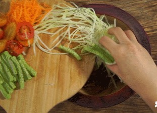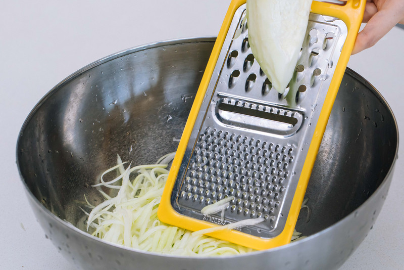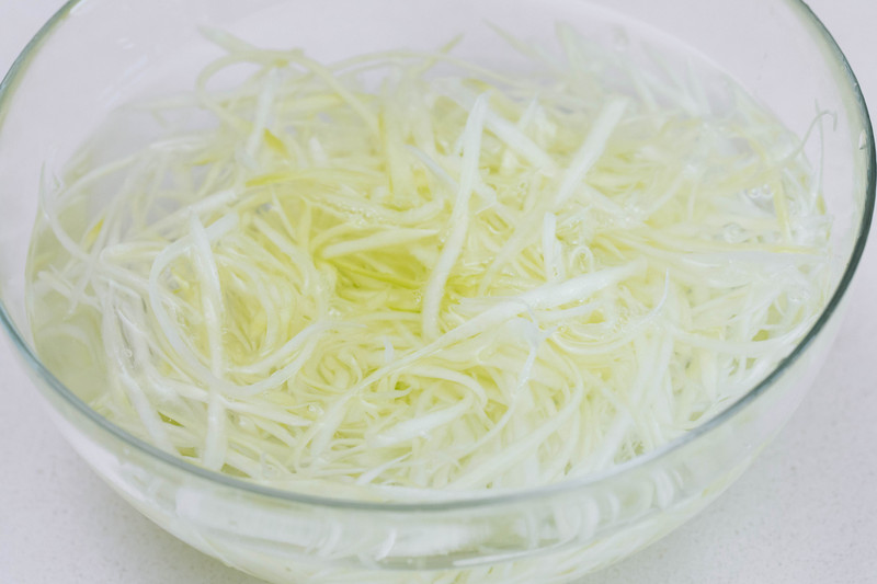 Bước 1: Đầu tiên, bạn dùng lưỡi dao nhọn, rạch những đường nhẹ lên vỏ đu đủ để loại bỏ nhựa. Sau đó rửa sạch rồi gọt vỏ và bỏ hạt 1/2 quả đu đủ xanh. Tiếp theo bạn nạo đu đủ thành sợi bằng dụng cụ nạo đa năng. Sau đó thả đu đủ vào chậu nước đá, ngâm trong khoảng nửa giờ rồi vớt ra để ráo. Lưu ý: Việc bạn rạch loại bỏ nhựa và ngâm trong nước đá sẽ giúp đu đủ loại bỏ vị chát/đắng.