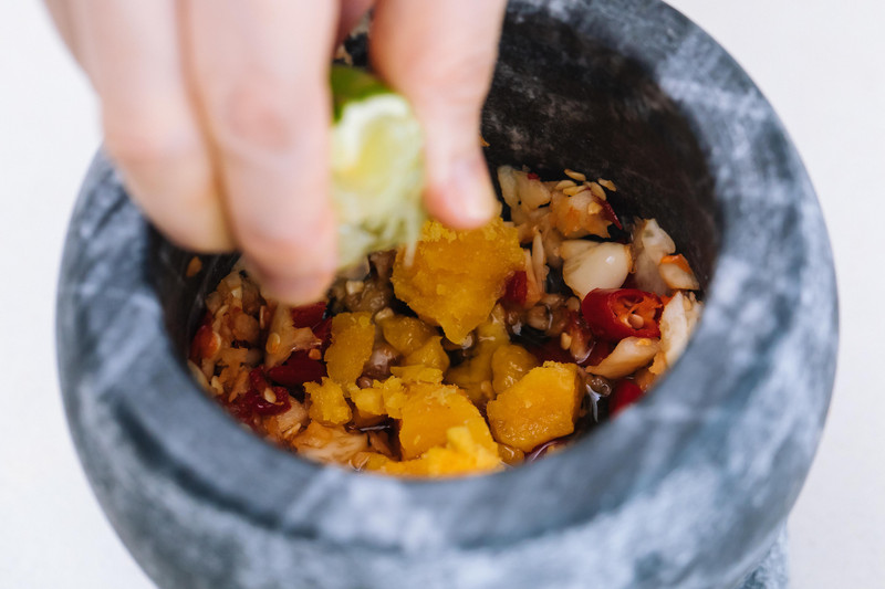 Bước 3: Bạn chuẩn bị sẵn cối và chày đã được khử trùng. Sau đó cho ớt và tỏi vào giã đến khi nhuyễn. Tiếp đó thêm đường thốt nốt (đã giã nhỏ), nước cốt chanh, sốt me và nước mắm vào, khuấy đều. Sau đó thêm đu đủ xanh đã bào sợi, cà rốt cắt nhỏ, đậu đũa, cà chua bi và tôm khô vào, giã cho đến khi thấm gia vị. Cuối cùng, bạn cho thêm một nắm đậu phộng vào, tiếp tục giã dập là có thể lấy ra đĩa rồi rắc rau húng quế xắt nhỏ lên.