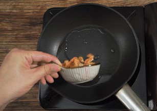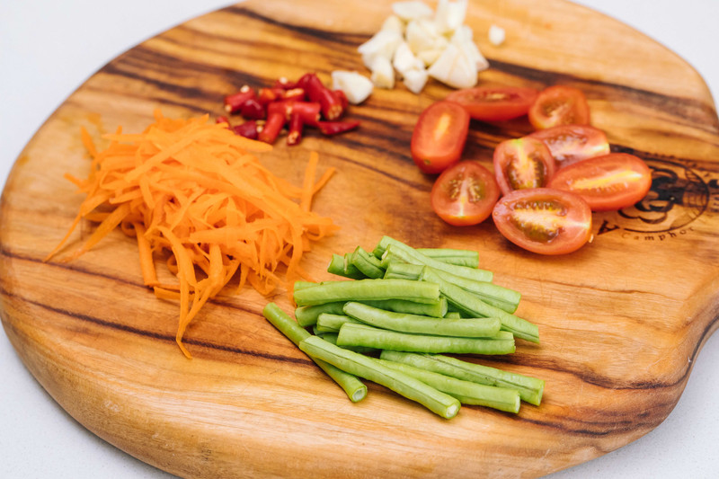 Bước 2: Tôm khô bạn rửa sạch, để ráo. Sau đó bạn đặt chảo lên bếp, thêm chút dầu ăn vào xào nhanh tay trong khoảng 5 phút. Rửa sạch và cắt đậu đũa thành từng khúc. Gọt vỏ và thái hoặc nạo sợi nửa củ cà rốt. Cà chua bi rửa sạch rồi cắt làm đôi. Tỏi bóc vỏ, đập dập rồi băm nhỏ. Cắt ớt thành từng miếng nhỏ.