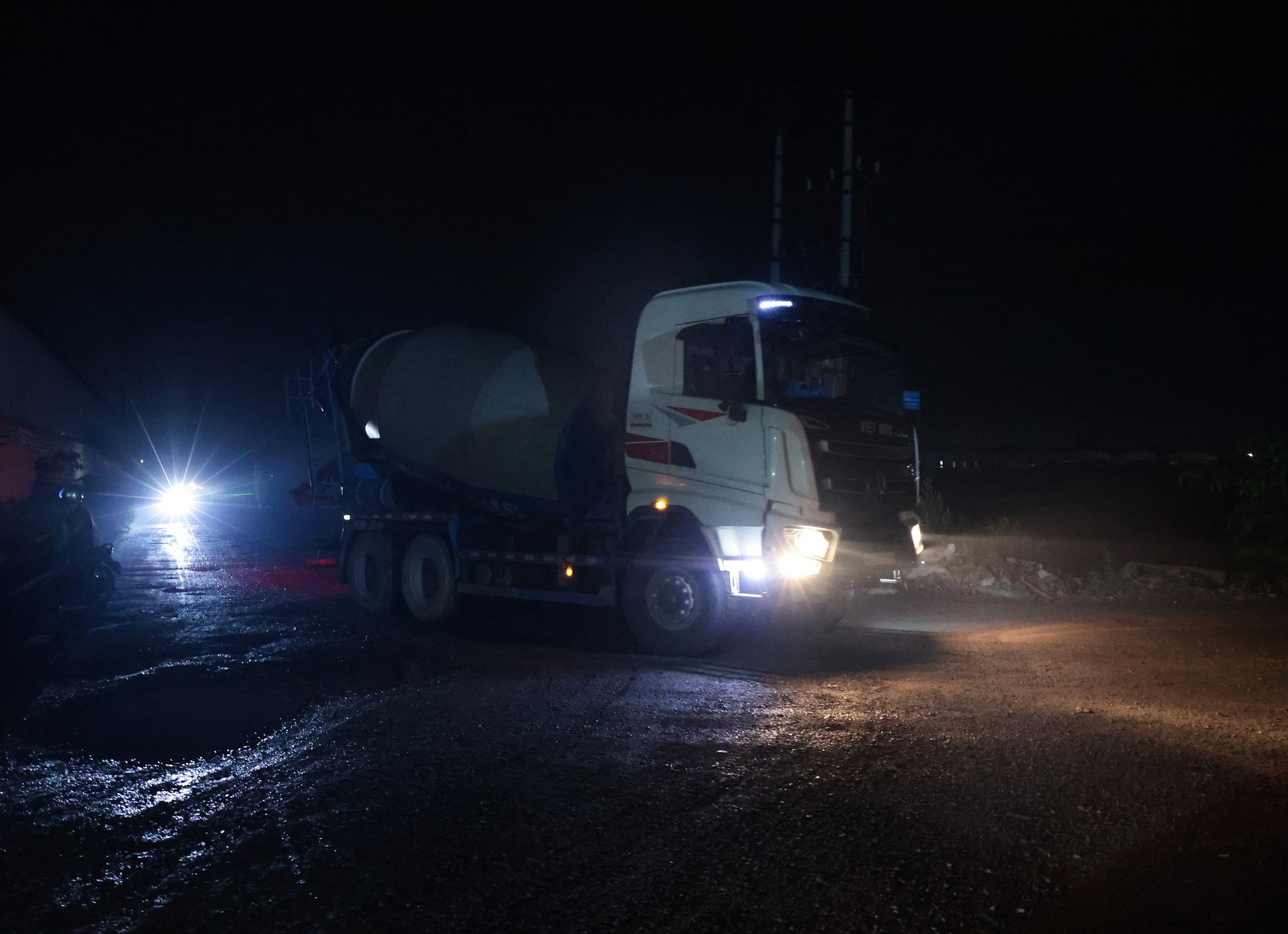 Hàng chục chiếc xe chở cát, bê tông liên tục ra vào hiện trường