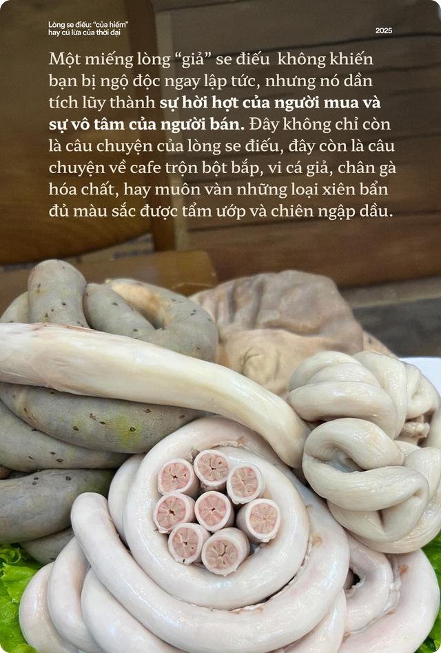 Sự sụp đổ niềm tin với món lòng se điếu không khiến ai mất nhà cửa, nhưng nó góp phần nuôi lớn văn hóa tiêu dùng dễ dãi và sẵn sàng chấp nhận rủi ro dù biết trước. Một miếng lòng “giả” se điếu không khiến bạn bị ngộ độc ngay lập tức, nhưng nó dần tích lũy thành sự hời hợt của người mua và sự vô tâm của người bán. Đây không chỉ còn là câu chuyện của lòng se điếu, đây còn là câu chuyện về cafe trộn bột bắp, vi cá giả, chân gà hóa chất, hay muôn vàn những loại xiên bẩn đủ màu sắc được tẩm ướp và chiên ngập dầu. Những thứ mà chúng ta dù biết nó không tốt nhưng vẫn tặc lưỡi cho qua vì rẻ, vì ngon, vì tiện. Lâu dần, chính chúng ta tạo nên một môi trường và hệ thống chấp nhận sự tồn tại của thực phẩm không an toàn, chấp nhận sự xuất hiện của hóa chất, chấp nhận sự mập mờ của nguồn gốc những thứ ta bỏ vào miệng. Đó mới là cái giá đắt nhất mà người tiêu dùng phải trả.