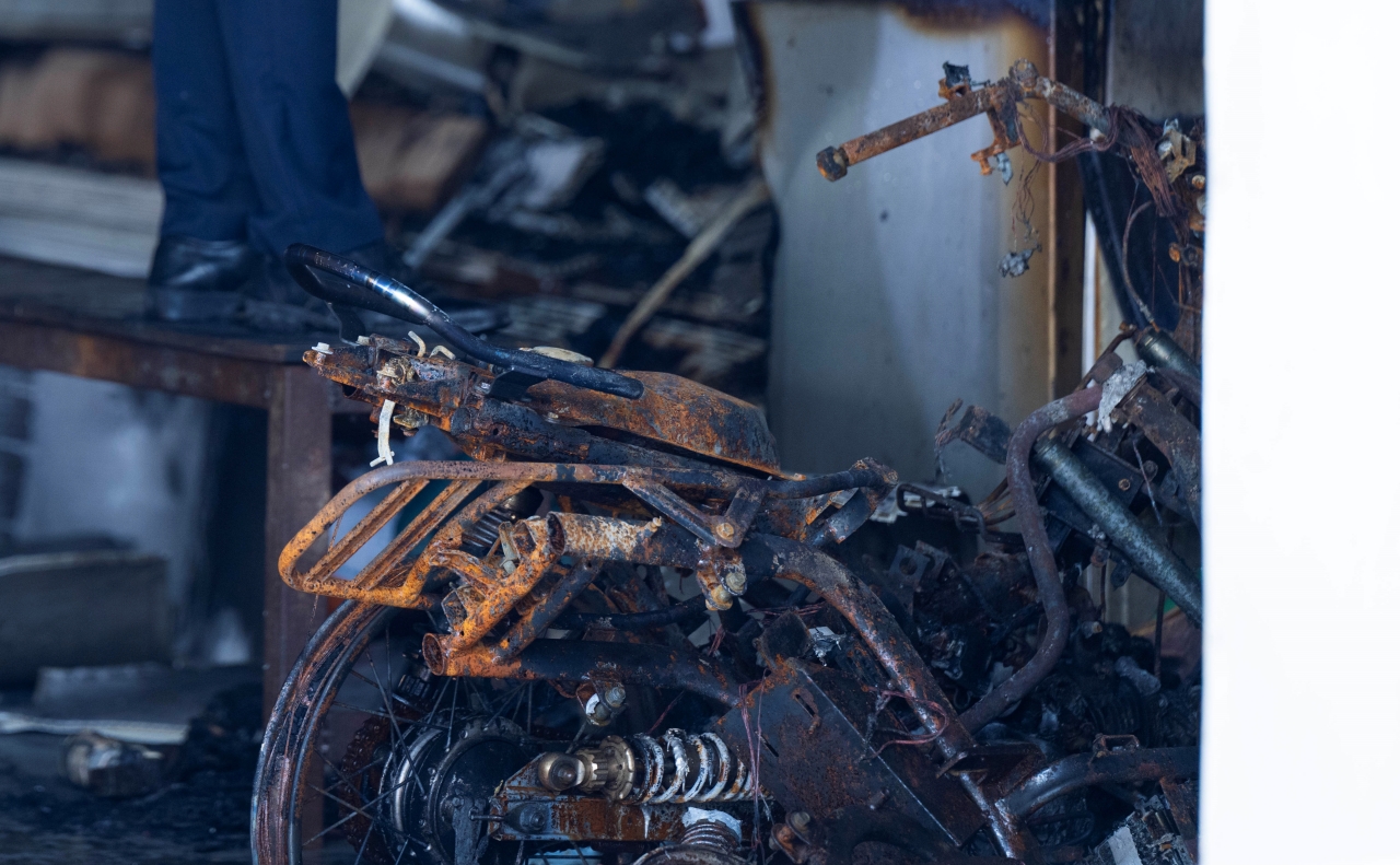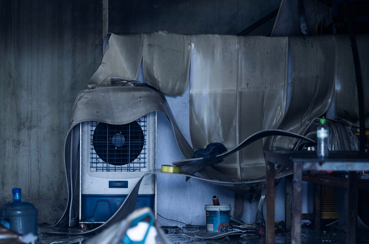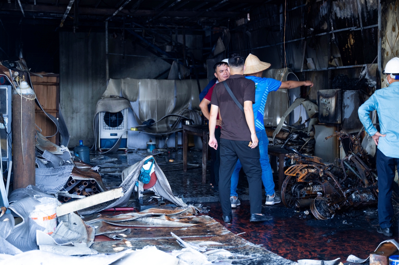 Bà Tươi cho biết thêm, tầng 1 của xưởng cơ khí được dùng để chứa đồ nghề và xe máy, còn gác xép phía trên là nơi cả gia đình bốn người sinh sống. Sau vụ cháy, toàn bộ đồ đạc trong xưởng bị thiêu rụi, phần tôn quây bên ngoài cũng bị biến dạng.