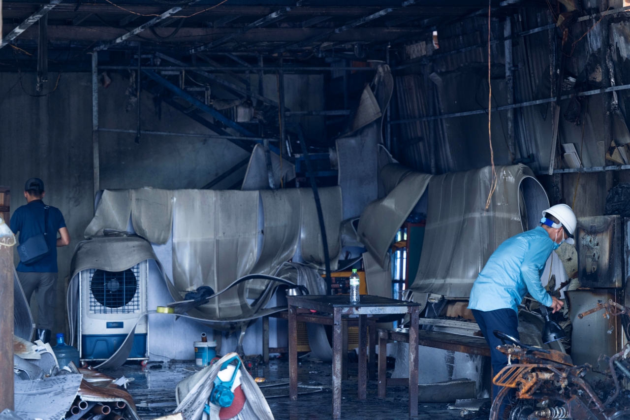 Mọi thứ bị ám khói đen, nhiều đồ nghề cơ khí của nạn nhân đang để ngổn ngang