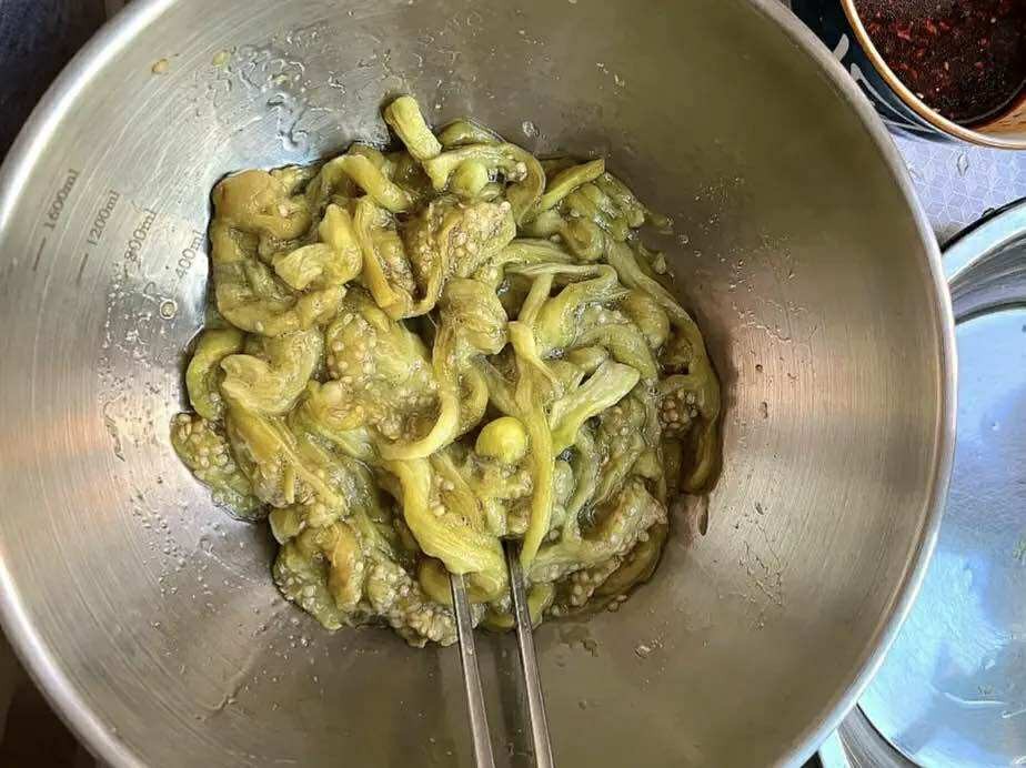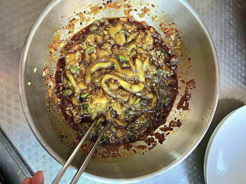 Bước 3: Cà tím sau khi hấp xong thì lấy ra để nguội. Tiếp đó bạn đeo găng tay thực phẩm rồi xé cà tím thành dạng sợi (hoặc bạn cũng có thể dùng 2 chiếc đũa để xé cà tím). Sau đó bạn cho cà tím đã xé vào âu trộn, thêm nước sốt vào, trộn đều. Cuối cùng bạn rắc thêm hành lá cắt nhỏ, vừng rang, lấy ra đĩa là có thể thưởng thức.
