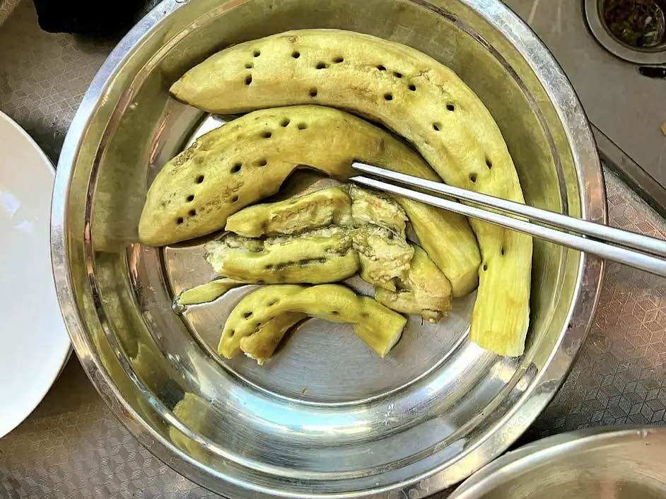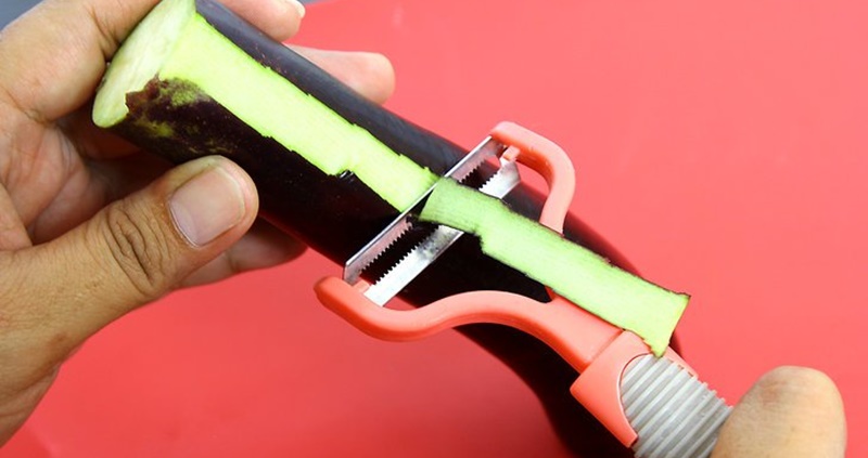Bước 1: Cắt bỏ cuống cà tím sau đó rửa sạch. Tiếp theo bạn dùng dụng cụ để nạo bỏ lớp vỏ cà tím rồi thả vào chậu nước muối pha loãng để ngăn quá trình oxy hóa, khiến cà tím bị thâm. Sau đó bạn cho cà tím vào nồi hấp và hấp trong khoảng 10-12 phút. Dùng đũa chọc vào cà tím nếu thấy dễ dàng xuyên qua thì có nghĩa đã chín.