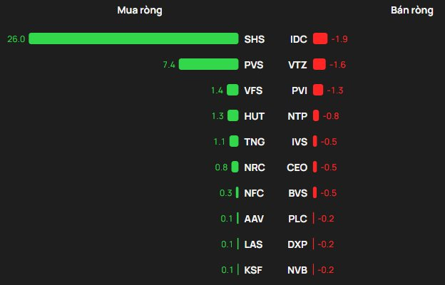 Tại chiều mua, SHS được mua ròng mạnh nhất với giá trị 26 tỷ đồng. Bên cạnh đó, PVS xếp tiếp theo trong sách mua ròng mạnh trên HNX với 7,4 tỷ đồng. Ngoài ra, khối ngoại cũng chi vài tỷ đồng để gom ròng VFS, HUT, TNG.