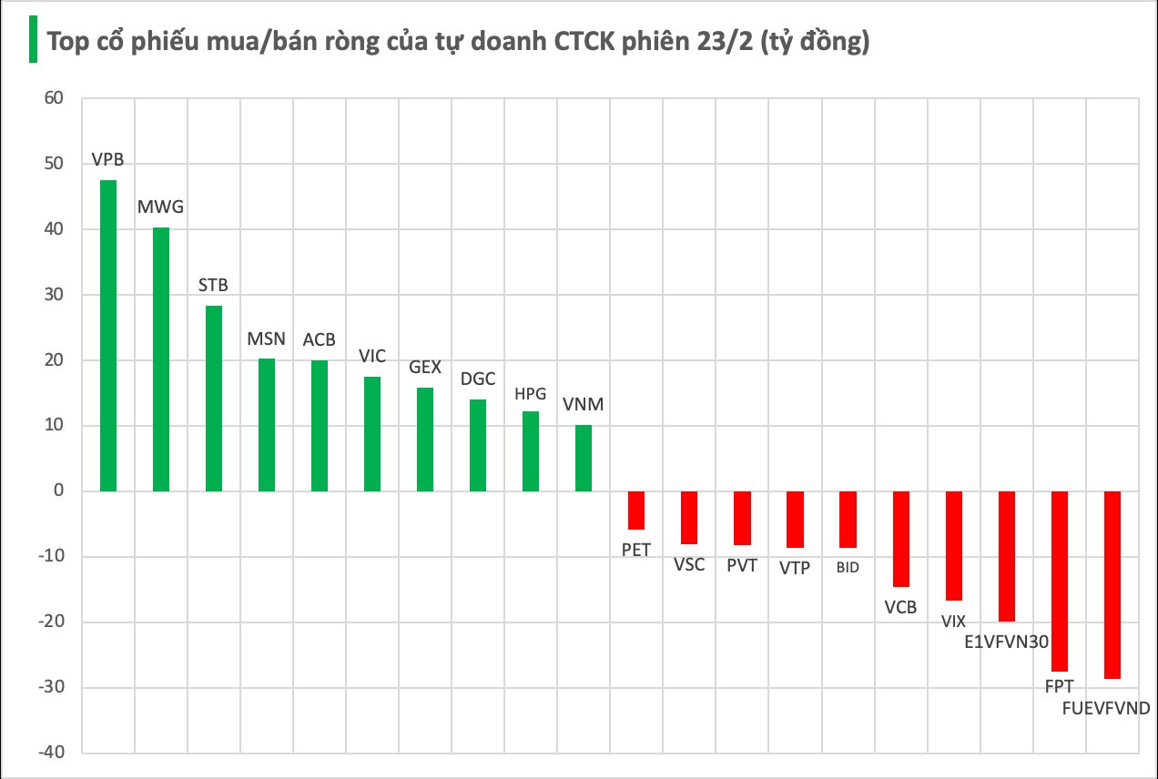 Cụ thể, VPB được mua ròng mạnh nhất với giá trị 48 tỷ đồng. Theo sau là MWG (40 tỷ), STB (28 tỷ), MSN (20 tỷ), ACB (20 tỷ), VIC (17 tỷ), GEX (16 tỷ), DGC (14 tỷ), HPG (12 tỷ) và VNM (10 tỷ đồng) đều được tự doanh CTCK mua tích cực.