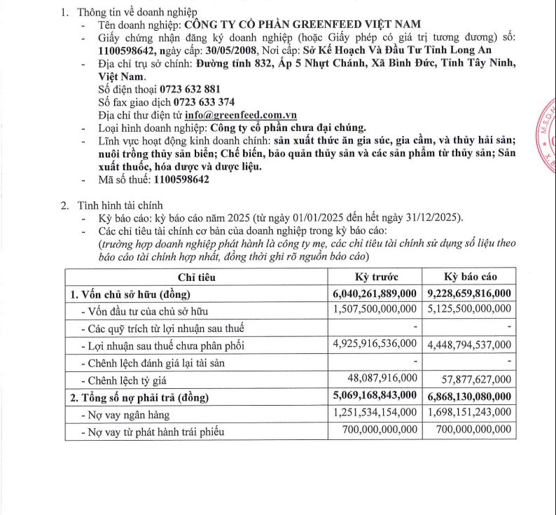Về sức khỏe tài chính, tính đến ngày 31/12/2025, vốn chủ sở hữu của GreenFeed Việt Nam là 9.228 tỷ đồng, tăng gần 3.200 tỷ đồng so với hồi đầu năm. Trong đó, vốn đầu tư của chủ sở hữu là 5.125 tỷ đồng, Lợi nhuận sau thuế chưa phân phối là 4.449 tỷ đồng và Chênh lệch tỷ giá là 57,8 tỷ đồng.