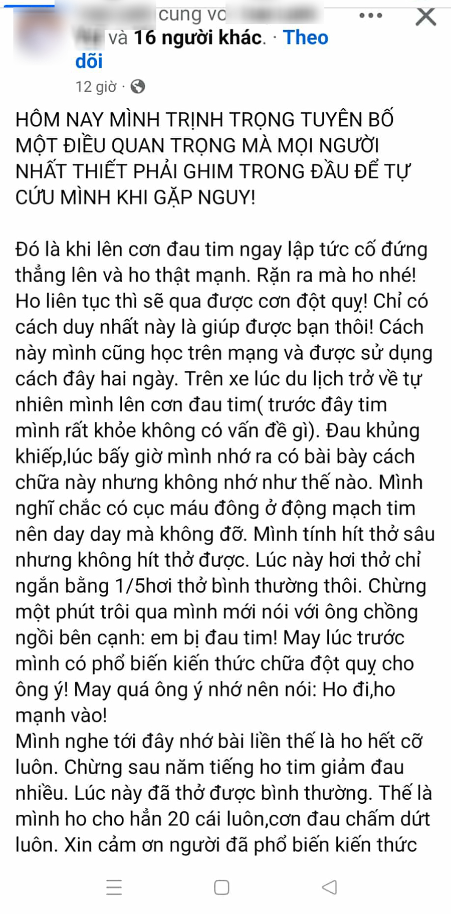 Trên Facebook mấy hôm nay, một tài khoản chia sẻ câu chuyện “khi lên cơn đau tim, ngay lập tức cố đứng thẳng lên và ho thật mạnh”. Theo như bài chia sẻ của chủ tài khoản này thì “ho liên tục thì sẽ qua được cơn đột quỵ! Chỉ có cách duy nhất này là giúp được bạn thôi!…”.