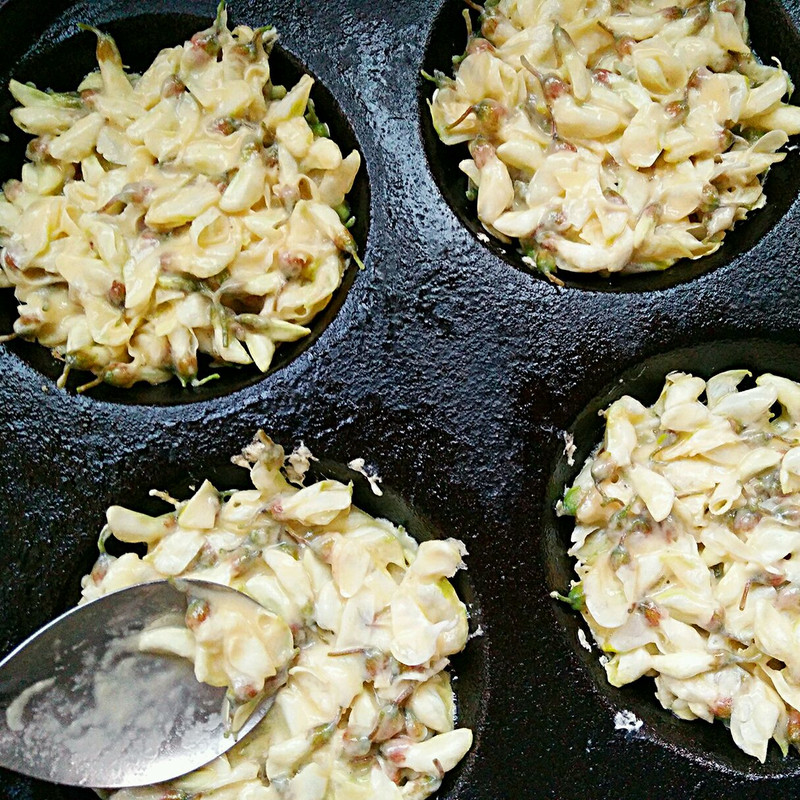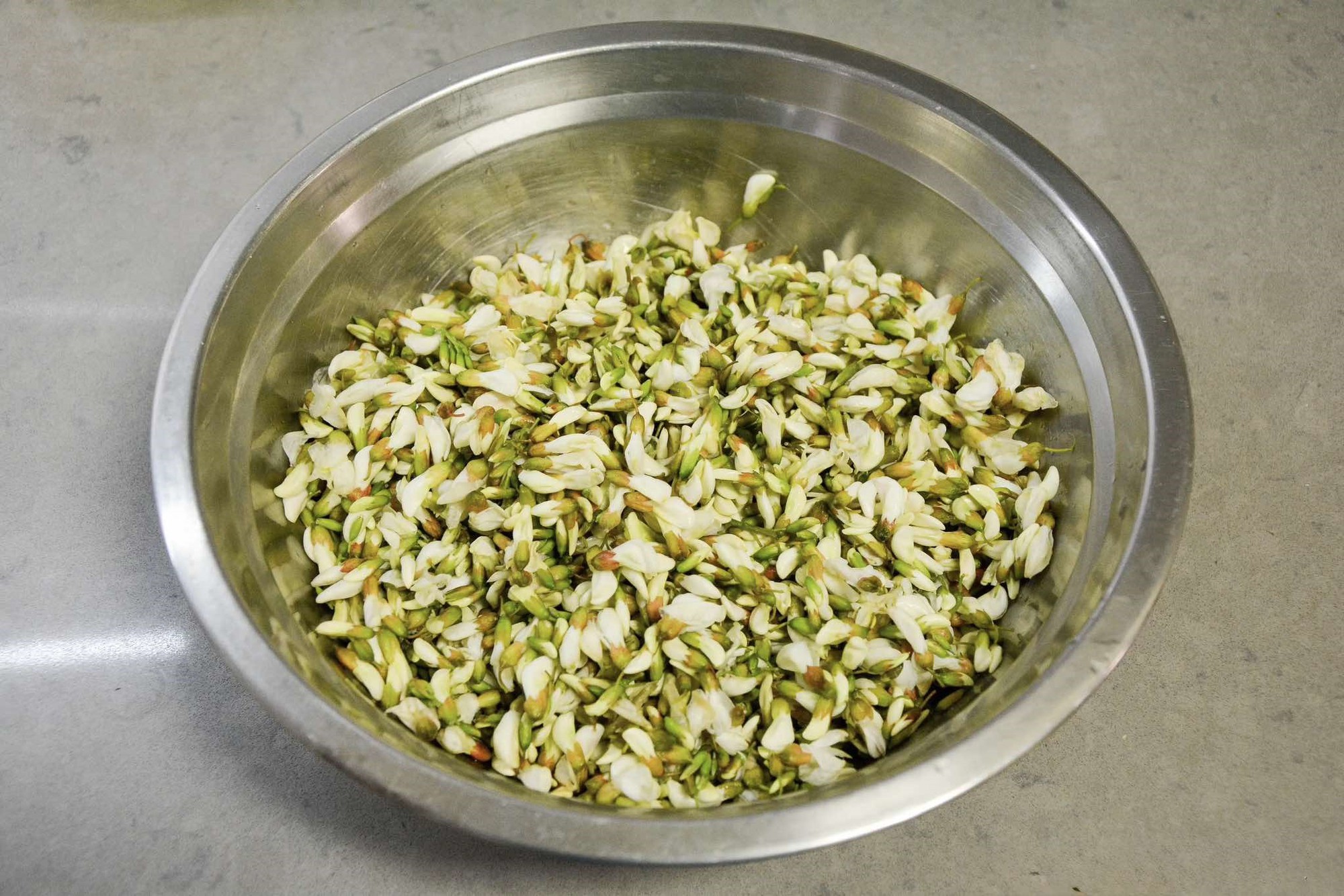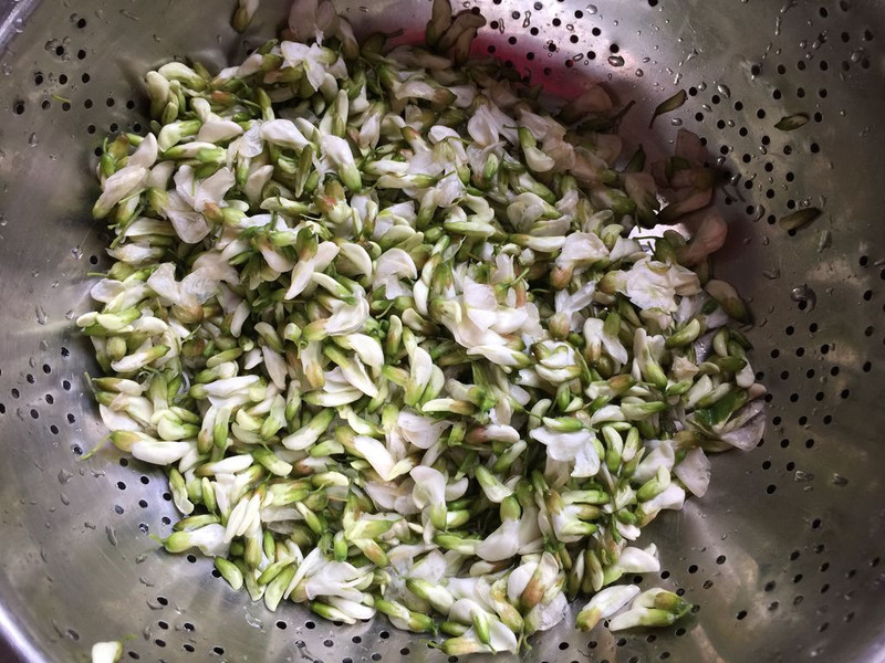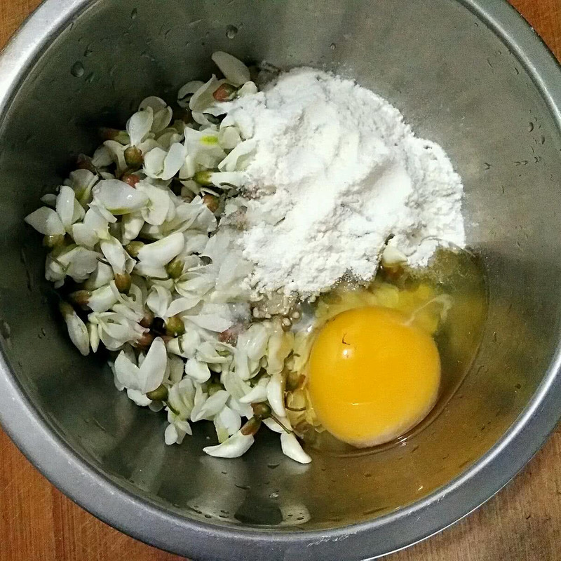 Bước 1: Nhặt bỏ cuống hoa hòe sau đó rửa sạch với nước. Cắt bỏ cuống hoa Sophora japonica và giữ lại hoa, sau đó rửa sạch với nước. Tiếp theo cho hoa hòe vào âu, đập trứng, thêm bột mì cùng chút gia vị rồi trộn đều.