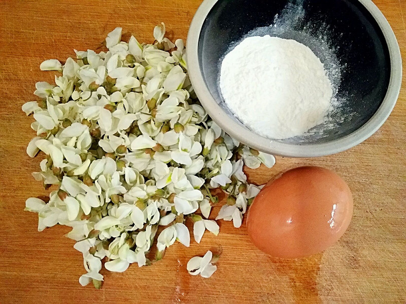 50g hoa hòe, 70g bột mì, 1 quả trứng gà, một chút xíu gia vị, lượng dầu oliu (hoặc dầu ăn) vừa phải.