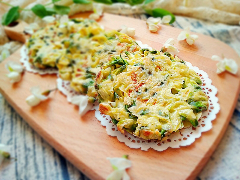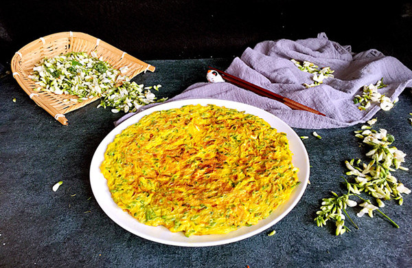 Bước 3: Đun nóng dầu trong chảo, khi dầu nóng khoảng 70% thì đổ trứng trộn hoa hòe vào. Lật và chiên cho đến khi 2 mặt trứng chuyển màu vàng nâu. Bạn lấy món trứng chiên hoa hòe ra đĩa, xắt thành các miếng vừa ăn là có thể dùng với cơm ngay rồi.