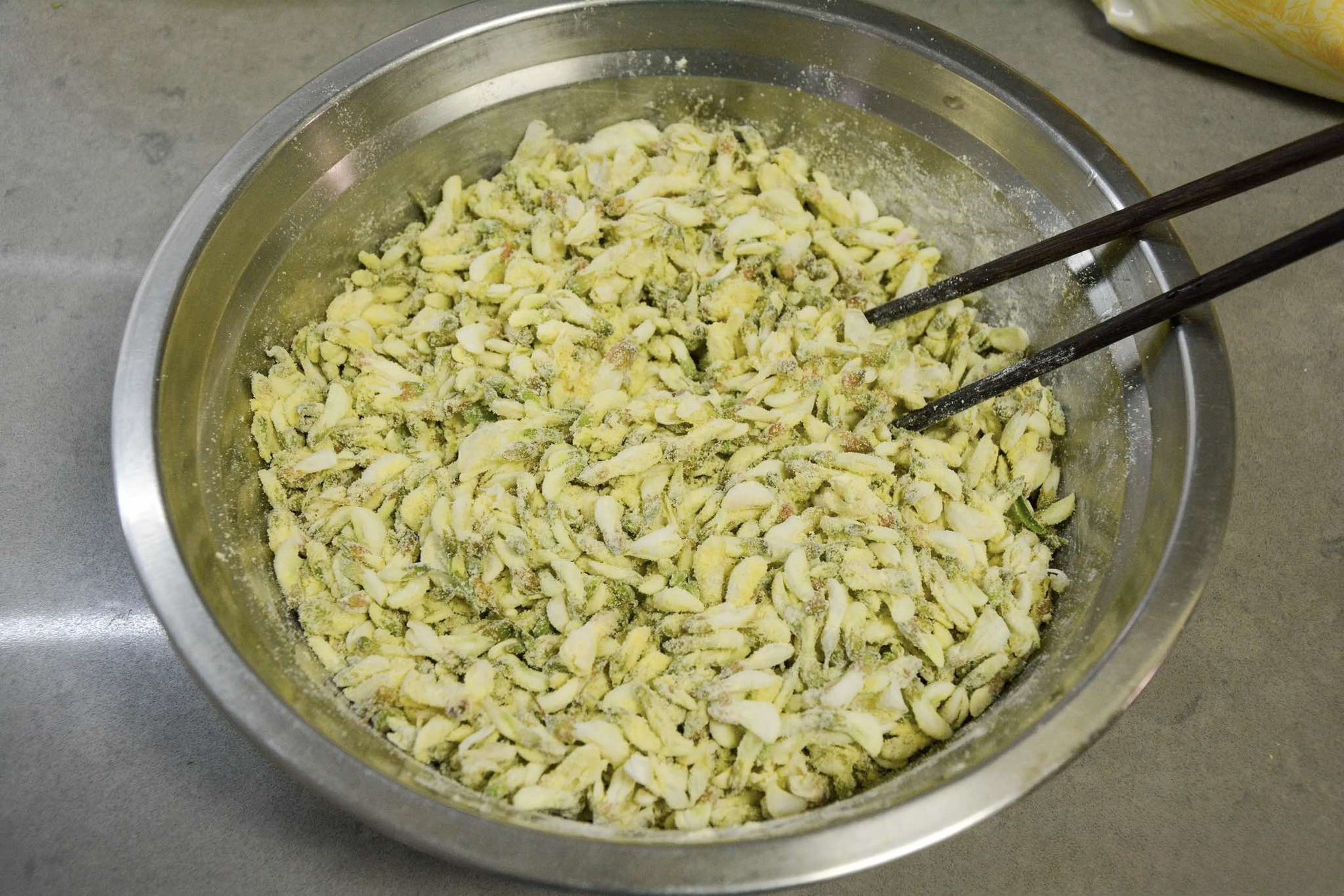 Bước 1: Hoa hòe bạn hái về nhặt khỏi cành, loại bỏ tạp chất rồi rửa sạch với nước muối pha loãng. Sau đó bạn rửa lại bằng nước sạch rồi để ráo. Tiếp theo bạn cho hoa hòe vào âu, thêm bột ngô vào (lưu ý thêm từng lượng nhỏ để phủ một lớp mỏng lên hoa và loại bột sử dụng phải bột mịn được nghiền trực tiếp từ hạt ngô). Tùy thuộc vào sở thích mà bạn có thể phủ lớp bột ngô mỏng hay dày.