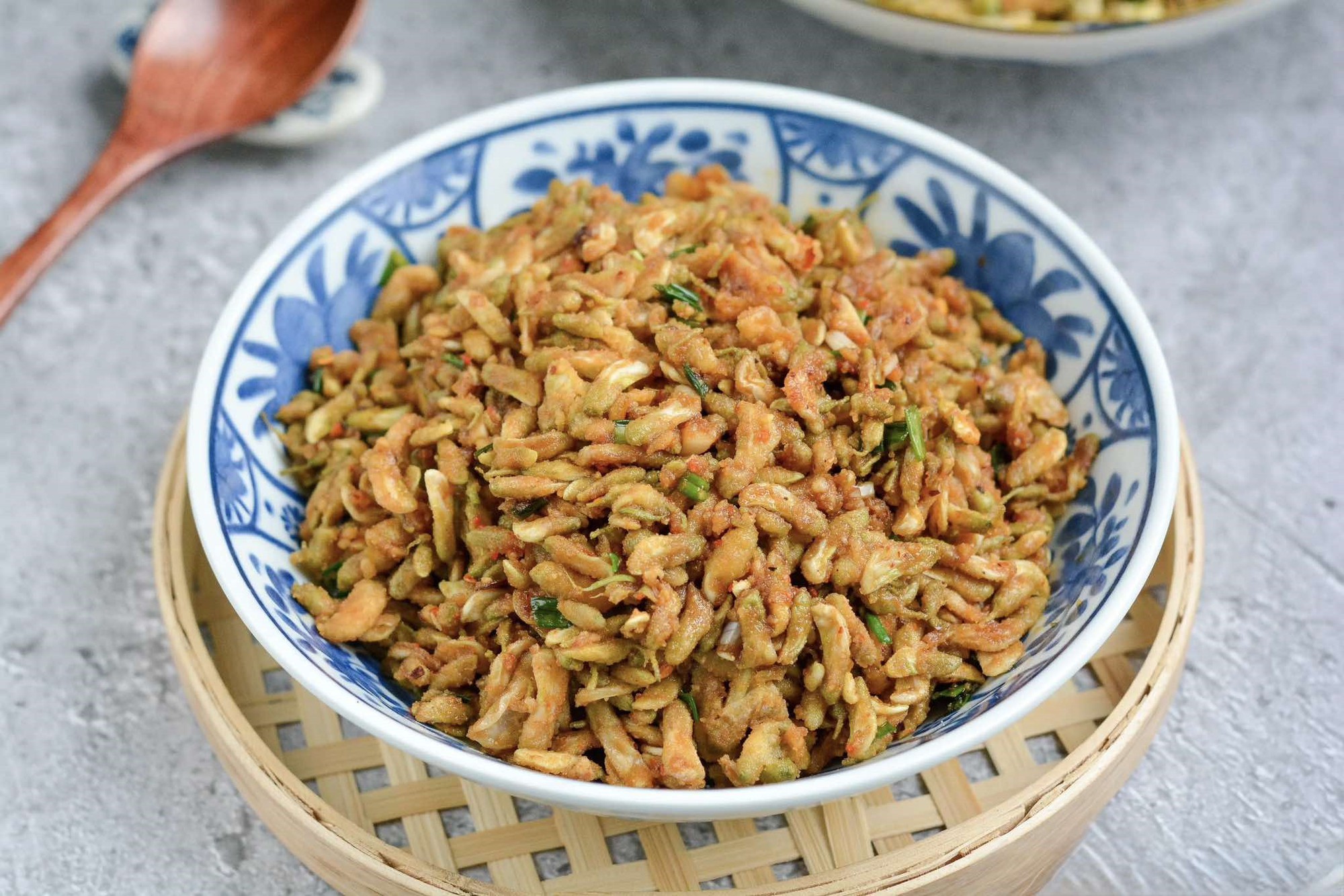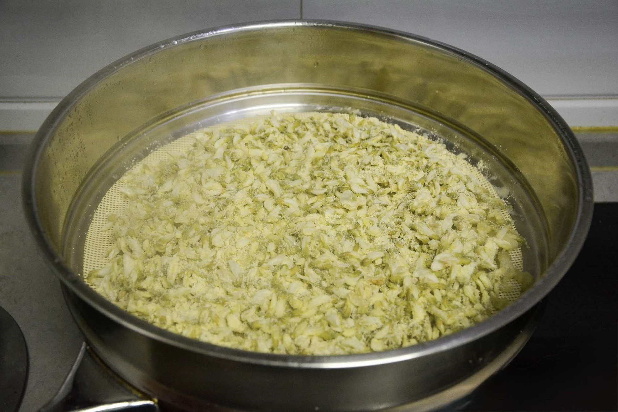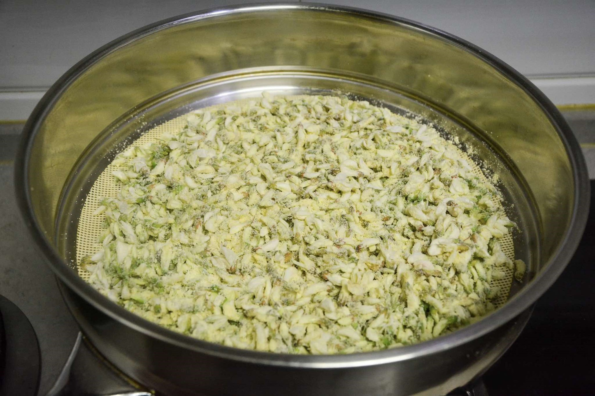Bước 2: Đặt nồi hấp lên bếp, đun sôi nước. Sau khi trộn hoa hòe với bột ngô xong, bạn rải đều hoa hoa hòe vào xửng hấp, dàn mỏng nhất có thể. Sau đó đậy nắp nồi lại và hấp ở lửa lớn trong khoảng 6 phút. Nếu lớp hoa của bạn rải mỏng thì thời gian hấp có thể rút ngắn hơn; nếu hoa rải dày thì thời gian hấp sẽ lâu hơn.