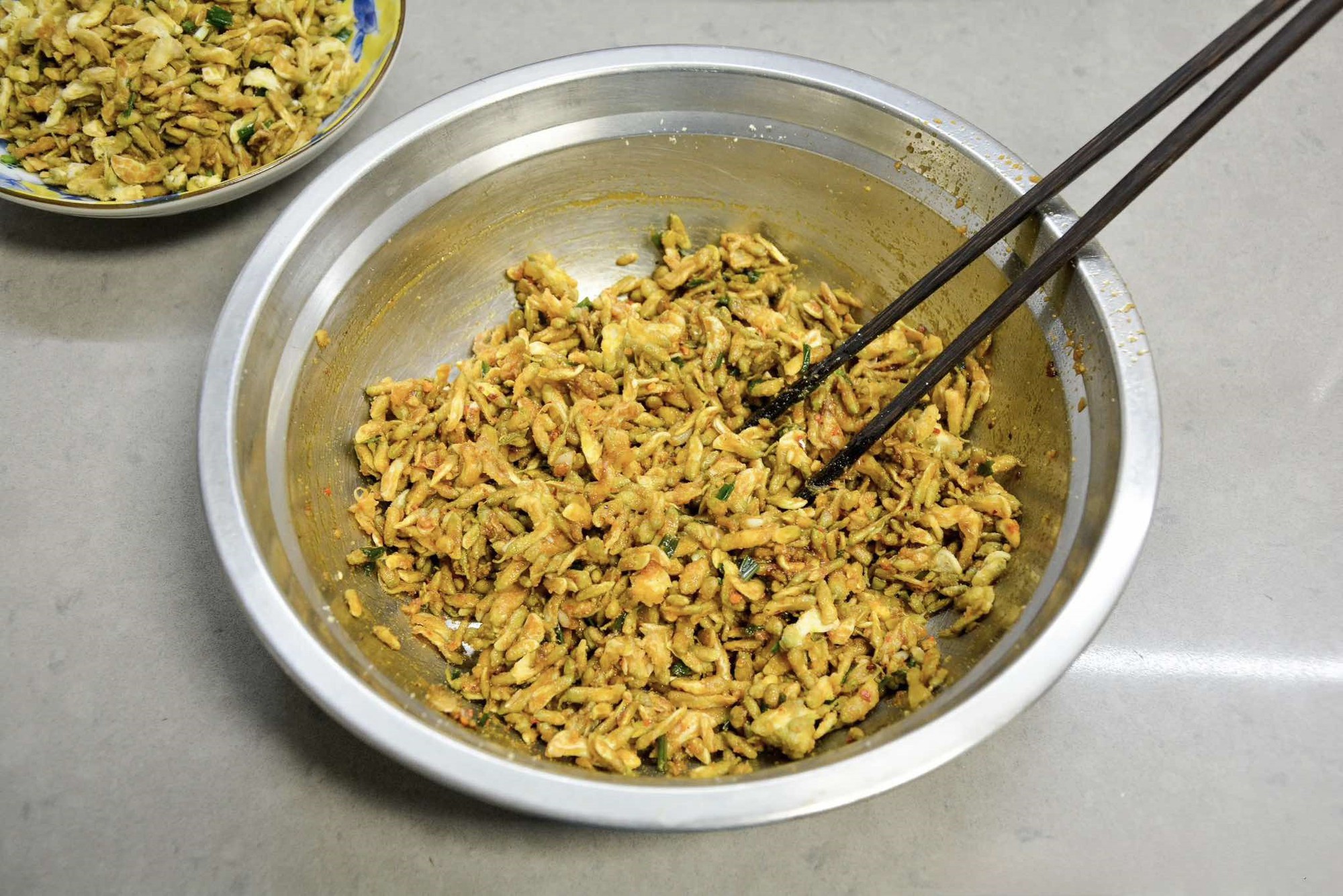 Bước 5: Tiếp theo bạn chuẩn bị 2 bát tô lớn, chia hoa hòe đã hấp làm 2 phần. Sau đó rưới lần lượt nước sốt với các vị khác nhay vào từng phần. Dùng đũa trộn đều là có thể thưởng thức. Khi bạn làm theo công thức này thì cùng một loại nguyên liệu chính là hoa hòe hấp nhưng sẽ có hương vị khác nhau khi ăn.