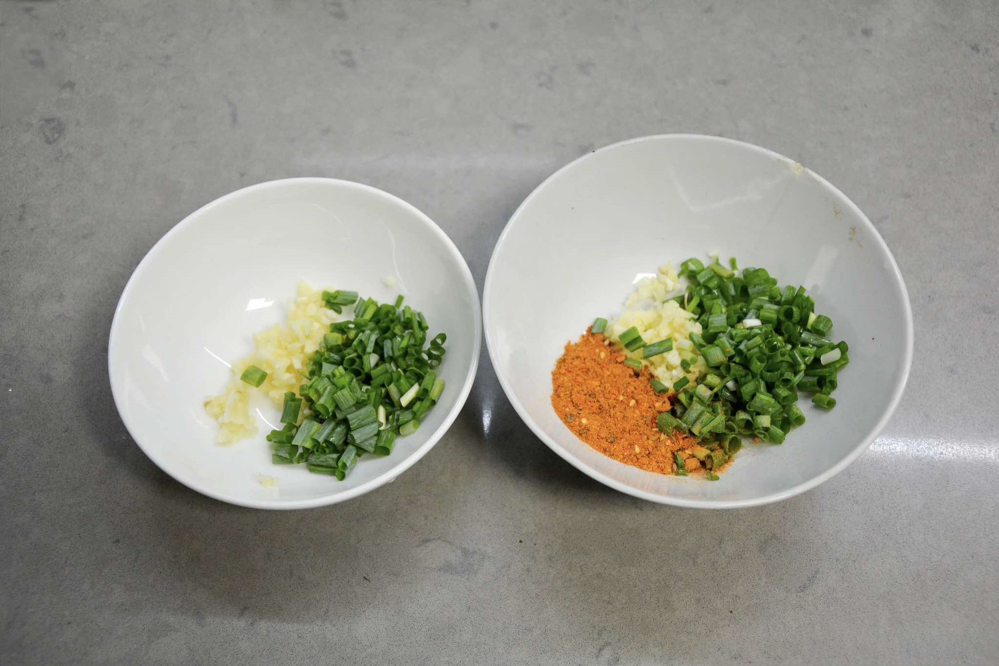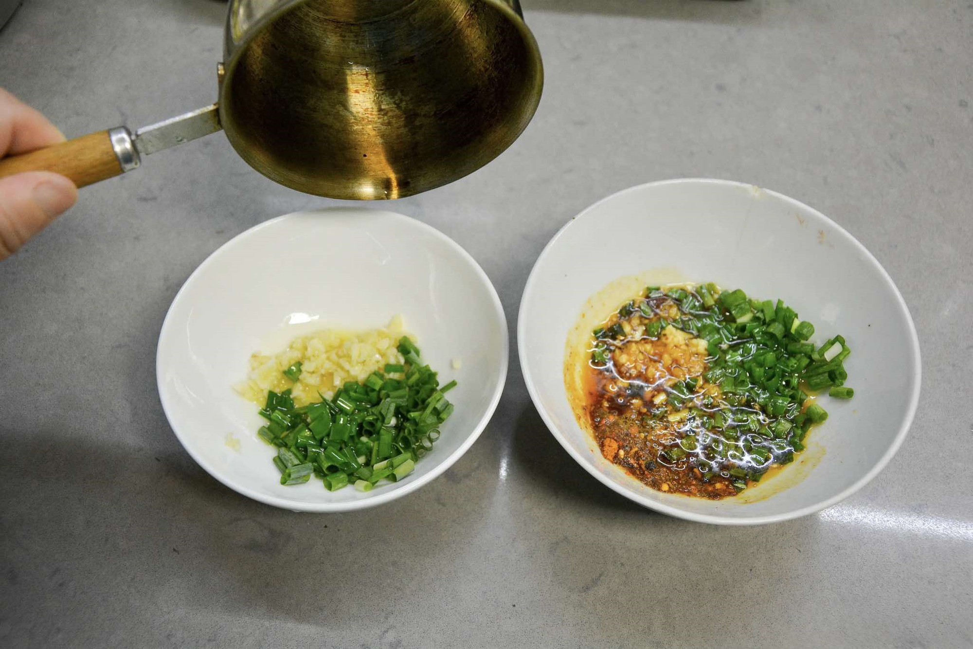 Bước 4: Cắt nhỏ hành lá, đập dậu và băm nhỏ tỏi rồi cho vào 2 chiếc bát. Nếu bạn ăn được cay hãy cho ớt bột (thêm ớt tươi cũng được) vào một bát. Tiếp theo bạn đun nóng lượng dầu oliu vừa phải rồi đổ vào 2 bát đựng các loại nguyên liệu gia vị. Sau đó thêm lần lượt nước tương, giấm vào rồi trộn đều.