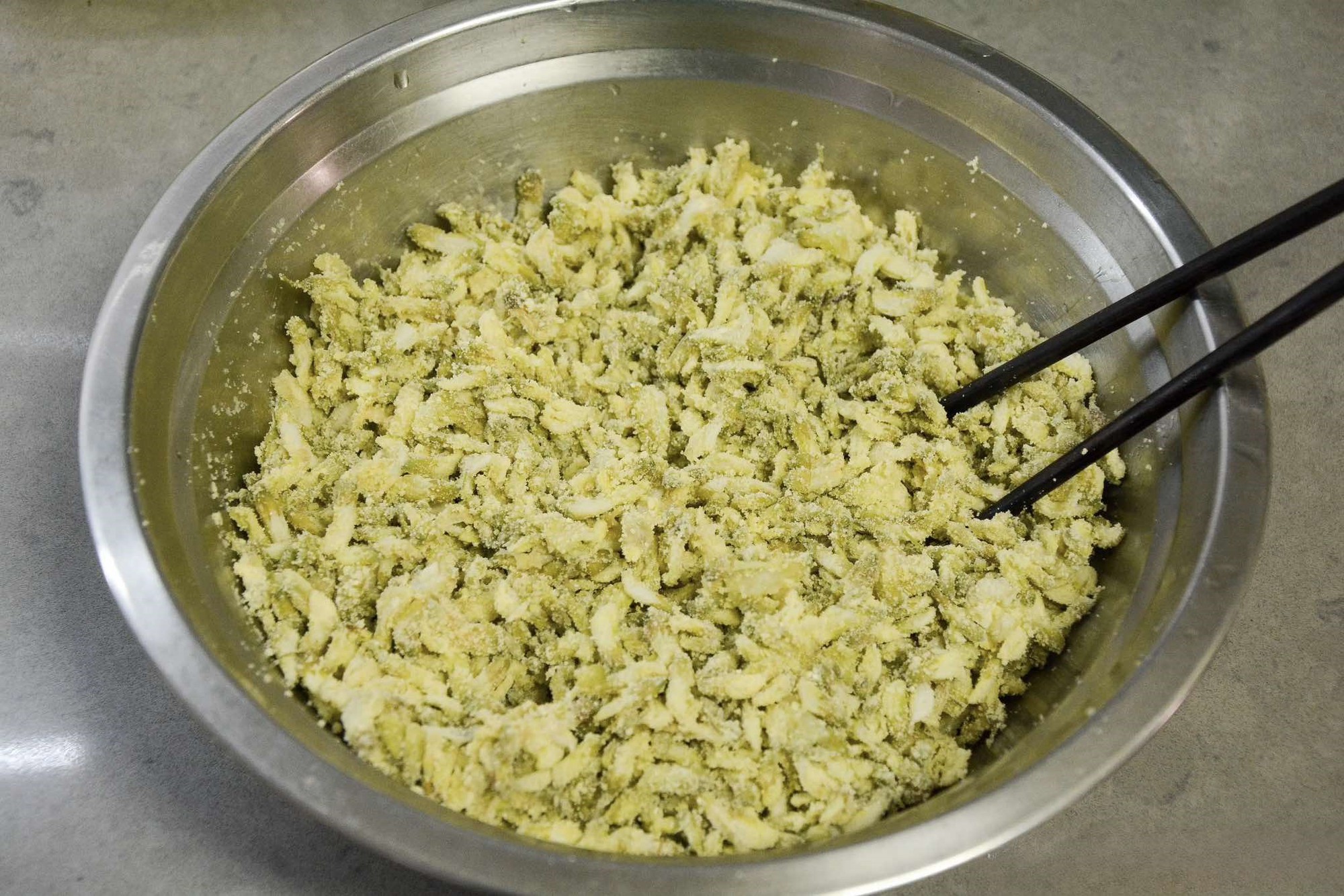 Bước 3: Khi hết thời gian, bạn cần phải mở nắp ngay ra, để tránh hơi nước rơi xuống làm lớp bột ngô bị ướt, sẽ dính vào nhau. Sau đó bạn đổ hoa hòe vừa hấp vào một âu lớn, khô ráo và dùng đũa để dàn đều ra sao cho mỗi bông hoa tách biệt.