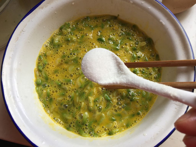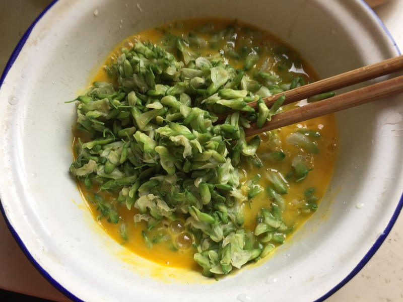 Bước 2: Đập trứng vào bát tô, thêm chút rượu nấu ăn, hoa hòe đã chần vào, trộn đều. Tiếp đó bạn cho chút gia vị vào, tiếp tục trộn đều một lần nữa.