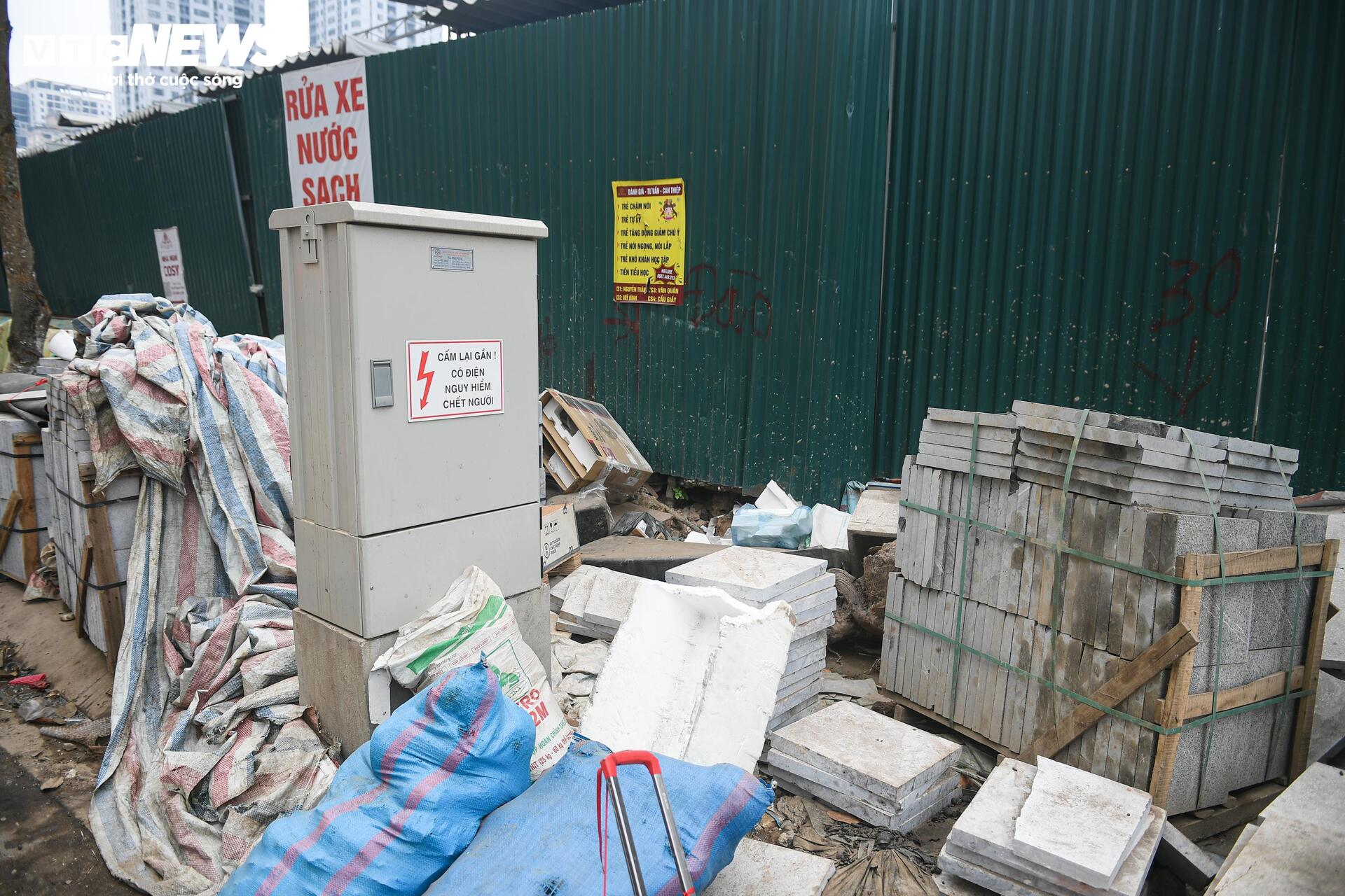 Ngoài ra, nhiều đoạn vỉa hè bị tận dụng làm nơi tập kết vật liệu, khiến không gian dành cho người đi bộ gần như không còn.