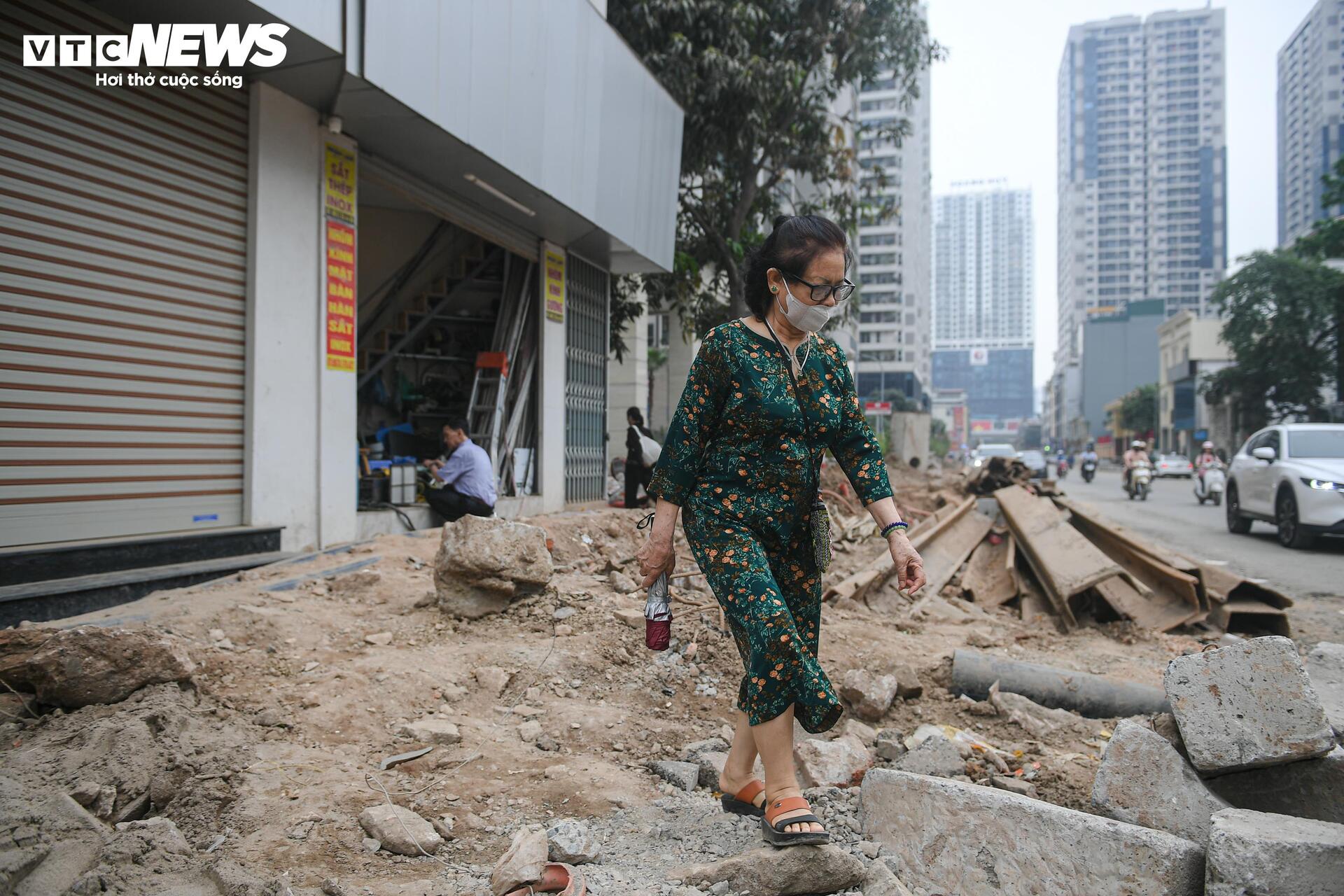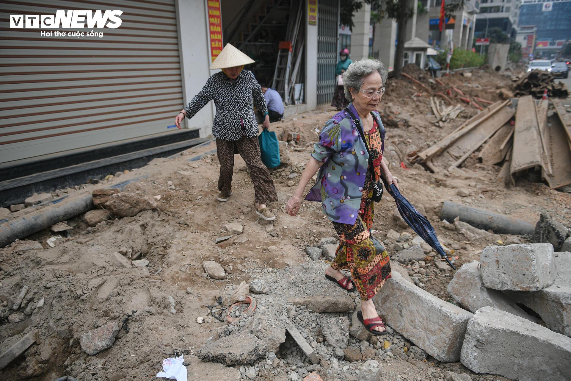 Tại khu vực đối diện số 105 Nguyễn Tuân, nhiều người đi bộ phải dò dẫm từng bước qua đoạn đường thi công ngổn ngang.