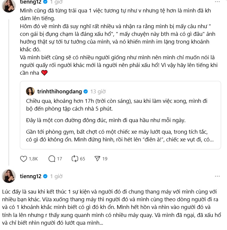 Giữa động thái mạnh mẽ của Hồng Đăng, Hoa hậu Thùy Tiên cũng chia sẻ lại bài viết của Á hậu Miss Universe Vietnam và cho biết cô cũng từng là nạn nhân bị quấy rối, đụng chạm khiếm nhã nơi công cộng như đồng nghiệp. Tuy nhiên, Thùy Tiên chia sẻ cô đã không dám lên tiếng tố cáo, lặng lẽ bỏ qua hành vi sai trái của kẻ xấu dù biết “thủ phạm” là ai vào thời điểm đó.