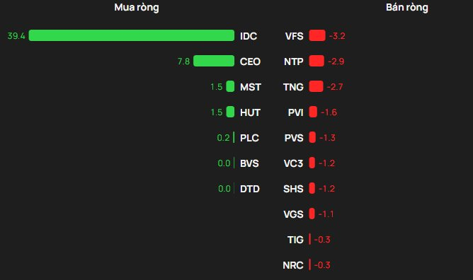 Ở chiều mua, khối ngoại mua ròng dẫn đầu là IDC với khoảng 39 tỷ đồng, bỏ xa các mã còn lại như CEO (8 tỷ đồng), MST (2 tỷ đồng), HUT (2 tỷ đồng) và PLC (0,2 tỷ đồng).