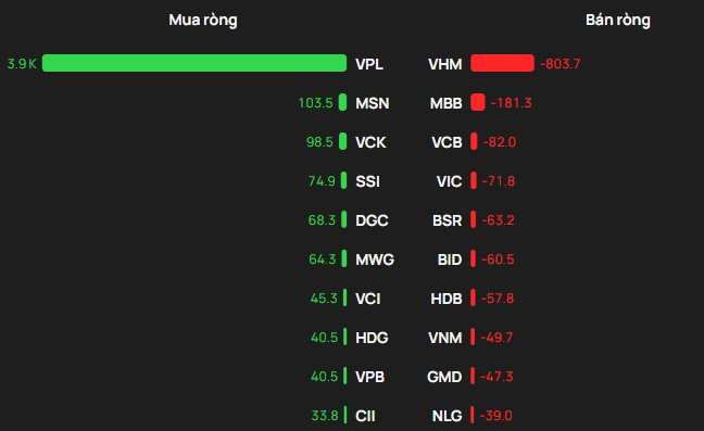 Khối ngoại bất ngờ đảo chiều mua ròng hơn 3.100 tỷ đồng trên toàn thị trường, dứt chuỗi bán ròng hàng chục phiên liên tiếp trước đó. Tuy nhiên, nếu loại trừ giao dịch đột biến tại cổ phiếu VPL, khối ngoại vẫn bán ròng khoảng 800 tỷ đồng phiên hôm nay.