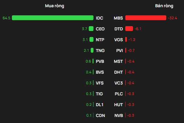 Tại chiều mua, IDC được mua ròng mạnh nhất với giá trị 65 tỷ đồng. Bên cạnh đó, CEO xếp tiếp theo trong sách mua ròng mạnh trên HNX với 4 tỷ đồng. Ngoài ra, khối ngoại cũng chi vài tỷ đồng để gom ròng NTP, TNG, PVB.