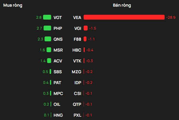 Ngược chiều, VEA bị khối ngoại bán ròng 29 tỷ đồng. Ngoài ra khối ngoại cũng bán ròng tại VGI, F88,…