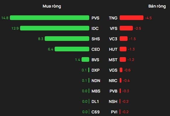 Tại chiều mua, PVS được mua ròng mạnh nhất với giá trị 130 tỷ đồng. Bên cạnh đó, IDC xếp tiếp theo trong sách mua ròng mạnh trên HNX với 13 tỷ đồng. Ngoài ra, khối ngoại cũng chi vài tỷ đồng để gom ròng SHS, CEO, BVS.