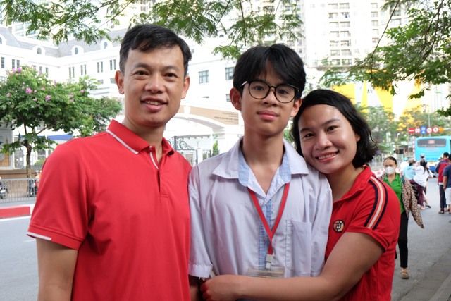 Có mặt từ sớm, vợ chồng chị Vũ Thị Út và anh Trần Bảo Long đưa con trai là em Trần Vũ Bảo Sơn đến điểm thi. Sơn là học sinh có học lực tốt, thuộc top đầu trường. Em dự thi chuyên Hà Nội – Amsterdam và đăng ký nguyện vọng 1 vào Trường THPT Phan Đình Phùng. Dù con đã tham gia nhiều cuộc thi, bố mẹ của Sơn vẫn không giấu được lo lắng trước kỳ thi lớp 10 được đánh giá là căng thẳng bậc nhất của học sinh phổ thông.