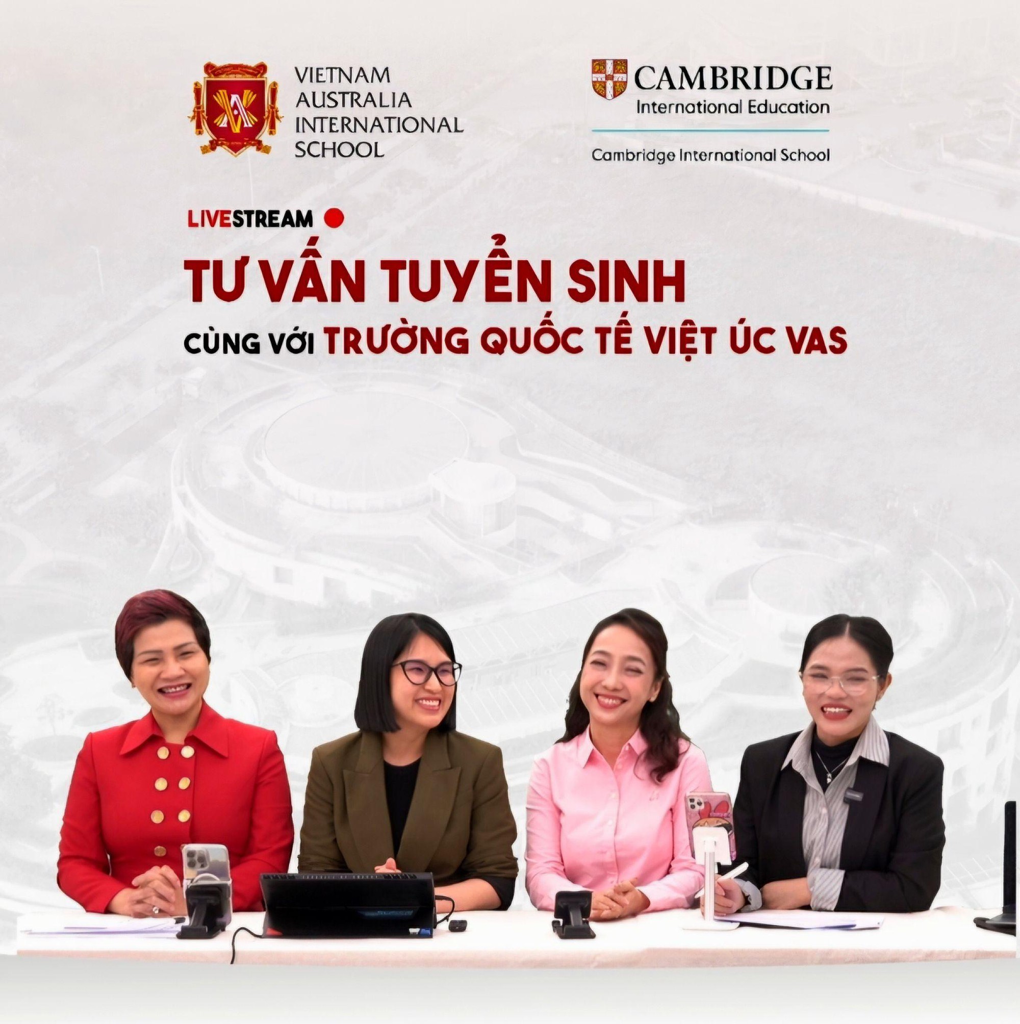 ThS. BS. Nguyễn Hiền Minh, phụ huynh – cựu học sinh Mỹ Huệ và cô Đỗ Thị Minh Châu – Giám đốc Khối Dịch vụ Trường học VAS (ngoài cùng bên trái) chia sẻ tại buổi Livestream – Tư vấn trực tuyến trên Trang Facebook VAS ngày 2/4/2025.
