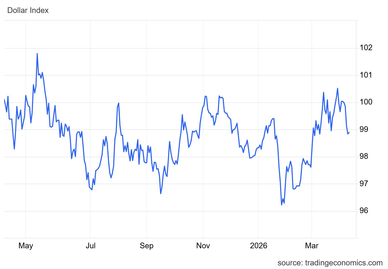 Trong vòng 1 tuần giao dịch trở lại đây, chỉ số Dollar Index đã giảm giá hơn 1,2%, cho thấy vai trò “hầm trú ẩn” của đồng bạc xanh đang có dấu hiệu suy yếu khi cuộc chiến tranh Mỹ – Iran có khả năng xuống thang và giá dầu hạ nhiệt xuống dưới mốc 100 USD/thùng.