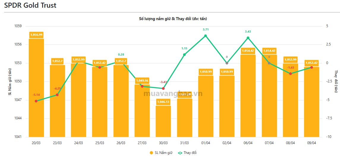 Theo cập nhật từ Muavangbac.vn, quỹ vàng lớn nhất thế giới SPDR Gold Trust tiếp tục bán ròng hơn 0,57 vàng trong ngày 9/4, tổng lượng vàng nắm giữ giảm còn hơn 1.052 tấn. Trong hai phiên vừa qua, quỹ này đã bán ròng khoảng 2 tấn vàng.