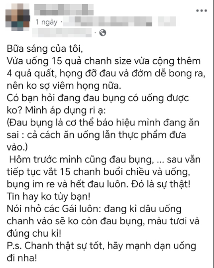 Cũng có người đều đặn uống nước chanh mỗi sáng để “thải độc”, thanh lọc gan, làm đẹp da. Thậm chí, không ít cá nhân còn mạnh dạn khẳng định mình uống đến 10-20 quả chanh mỗi ngày vì cho rằng chanh lành tính, tốt cho sức khỏe, “càng nhiều càng tốt”.