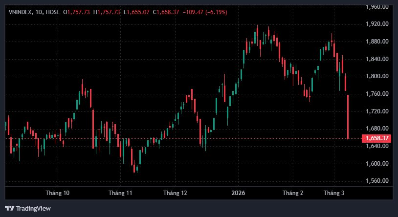 Tính đến 10h30p, VN-Index “bốc hơi” 110 điểm, tương đương gần 6,2%, lùi xuống 1.657 điểm – đánh dấu phiên giảm mạnh nhất trong lịch sử thị trường chứng khoán Việt Nam.
