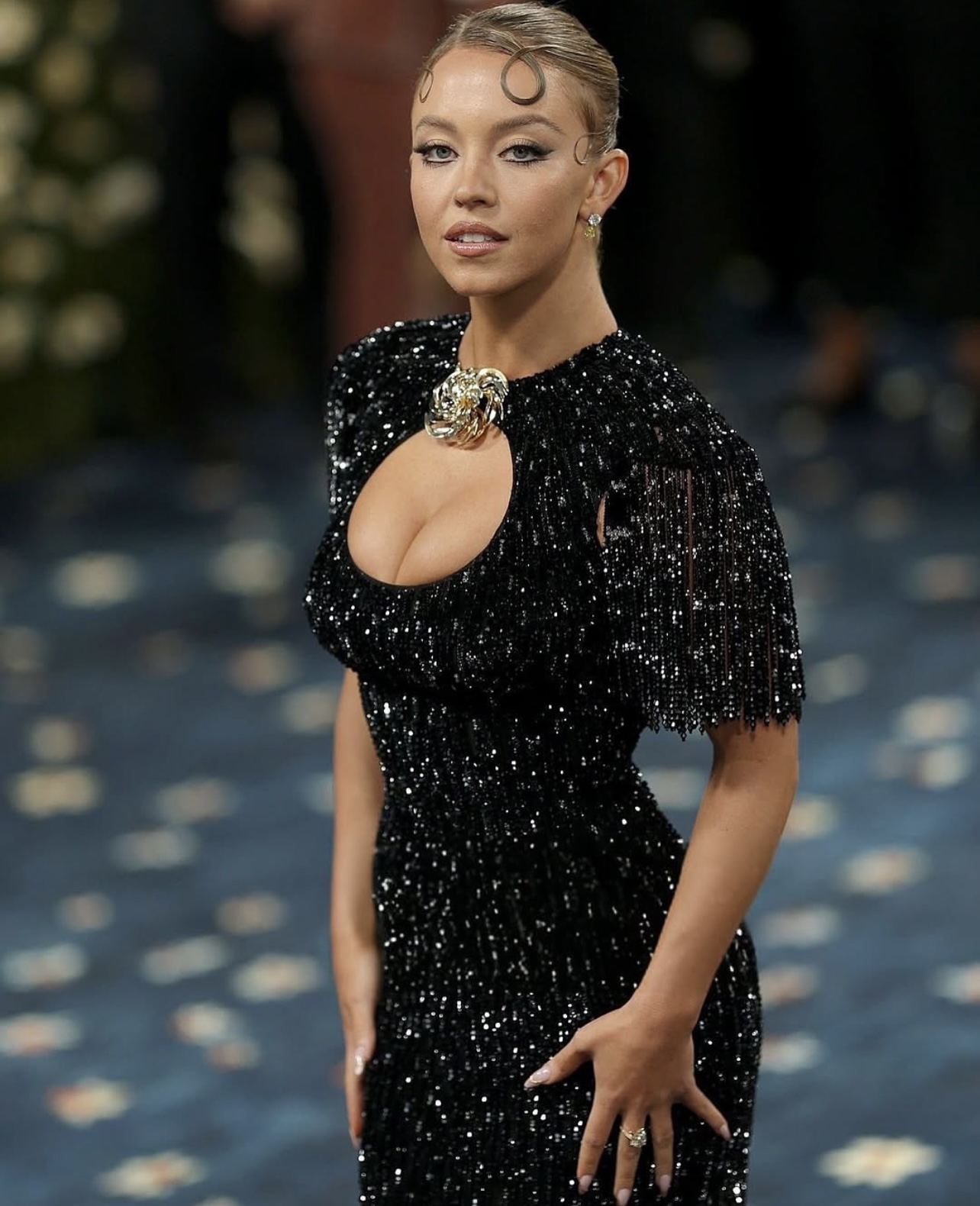 Cũng lựa chọn trang phục đến từ nhà mốt Miu Miu, Sydney Sweeney khoe trọn đường cong nóng bỏng trong bộ váy màu đen ôm sát lấp lánh. Được biết, trang phục của cô được lấy cảm hứng từ nữ diễn viên Kim Novak.