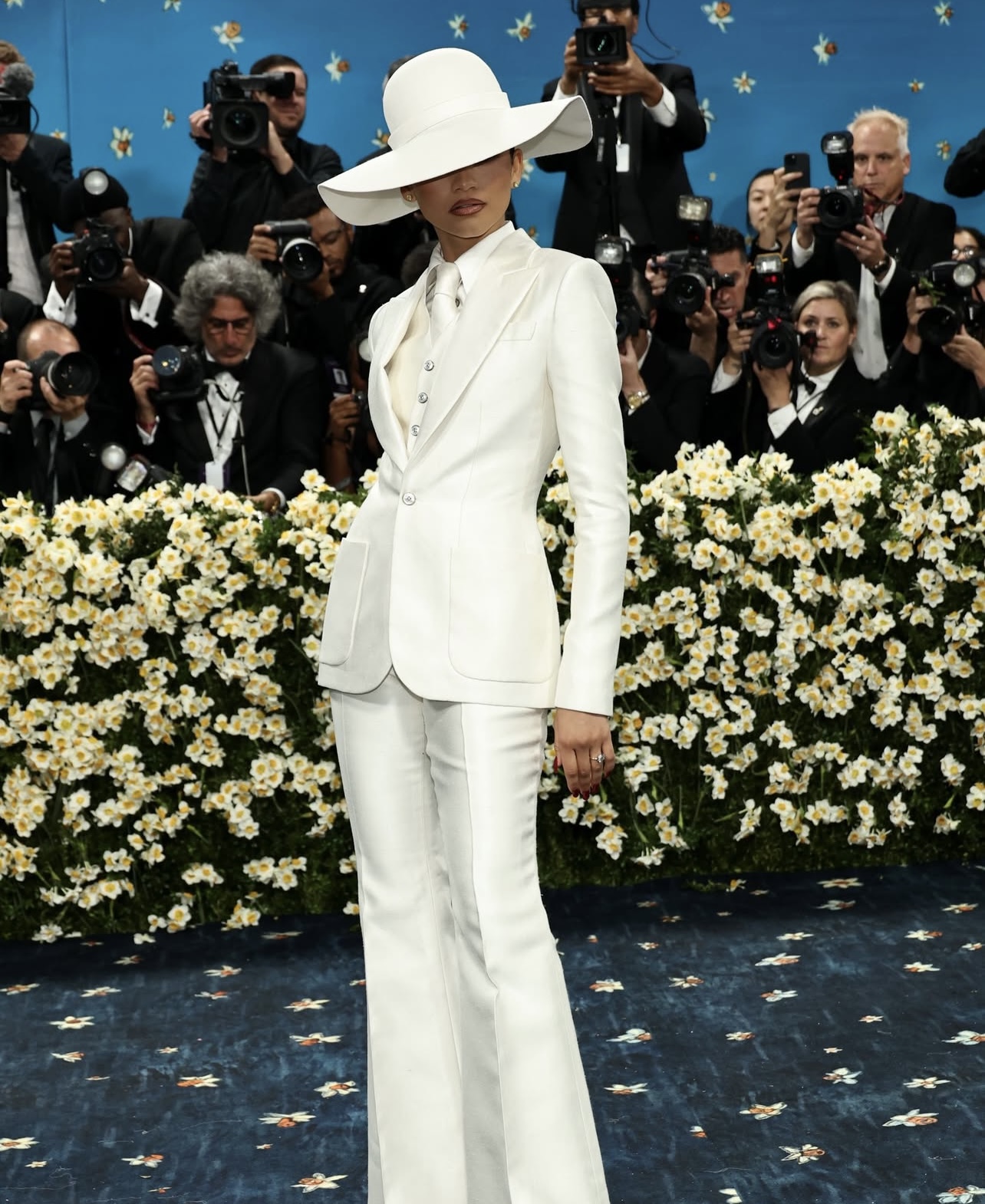 Lại slay như thường lệ, Zendaya đơn giản mà đúng chủ đề khi khoác lên mình bộ suit trắng classic của Louis Vuitton, không quên phụ kiện là chiếc mũ rộng vành ton-sur-ton. Trang phục lần này của Zendaya được lấy cảm hứng từ Bianca Jagger – biểu tượng của thời trang menswear thập niên 1970’s và danh ca người Mỹ Diana Ross. Dù chiếc mũ che nửa gương mặt nhưng nữ diễn viên vẫn khiến dân tình khó rời mắt bởi thần thái sang chảnh ngút ngàn.